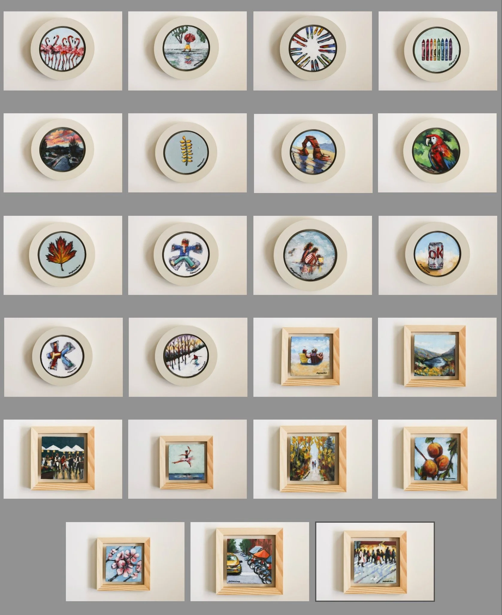 5×5 inch acrylic painting on a flat panel, finished with a clear semi-gloss varnish. Framed in an 8×8 inch light wood floater frame, wired and ready to hang or can purchase unframed.