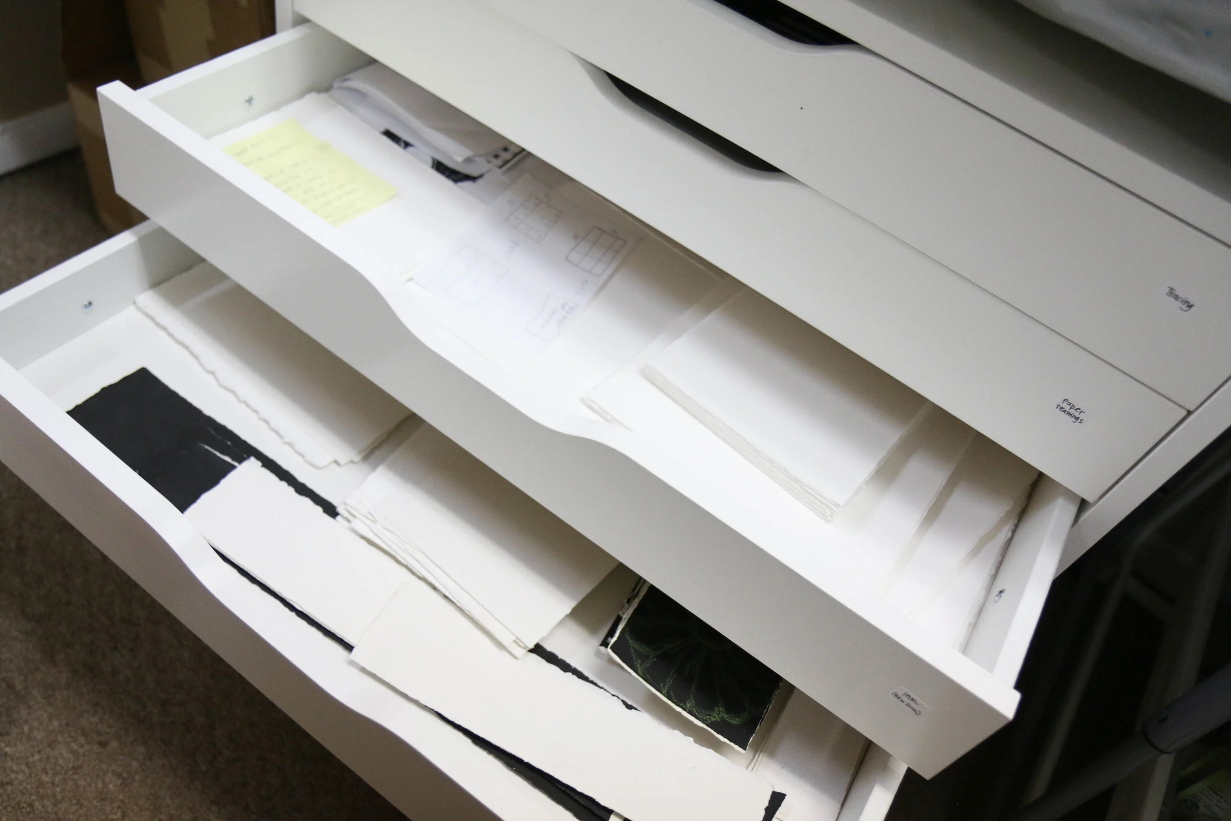 I bought a flat file at Ikea (http://www.ikea.com/us/en/catalog/products/40196241/) to store all my sketch books, drawings and papers. It fits nicely under one of my tables and keeps all my nice paper flat and clean ready for drawing and painting on. The stickers on the drawers labeling them are Avery Removable All-Purpose Labels (https://www.walmart.com/ip/Avery-R-Removable-ID-Labels-Handwrite-Only-1-2-x-3-4-labels-2-7-8-x-4-1-16-sheets-White-Removable-25-up-21-sheets-525-PK/17163682) and they're the best for labeling things and not leaving a sticky residue. I use them for vendor numbers for markets (that I might not want to leave on my product forever) or price tags or all kinds of things. They peel right off and don't hurt the item at all.