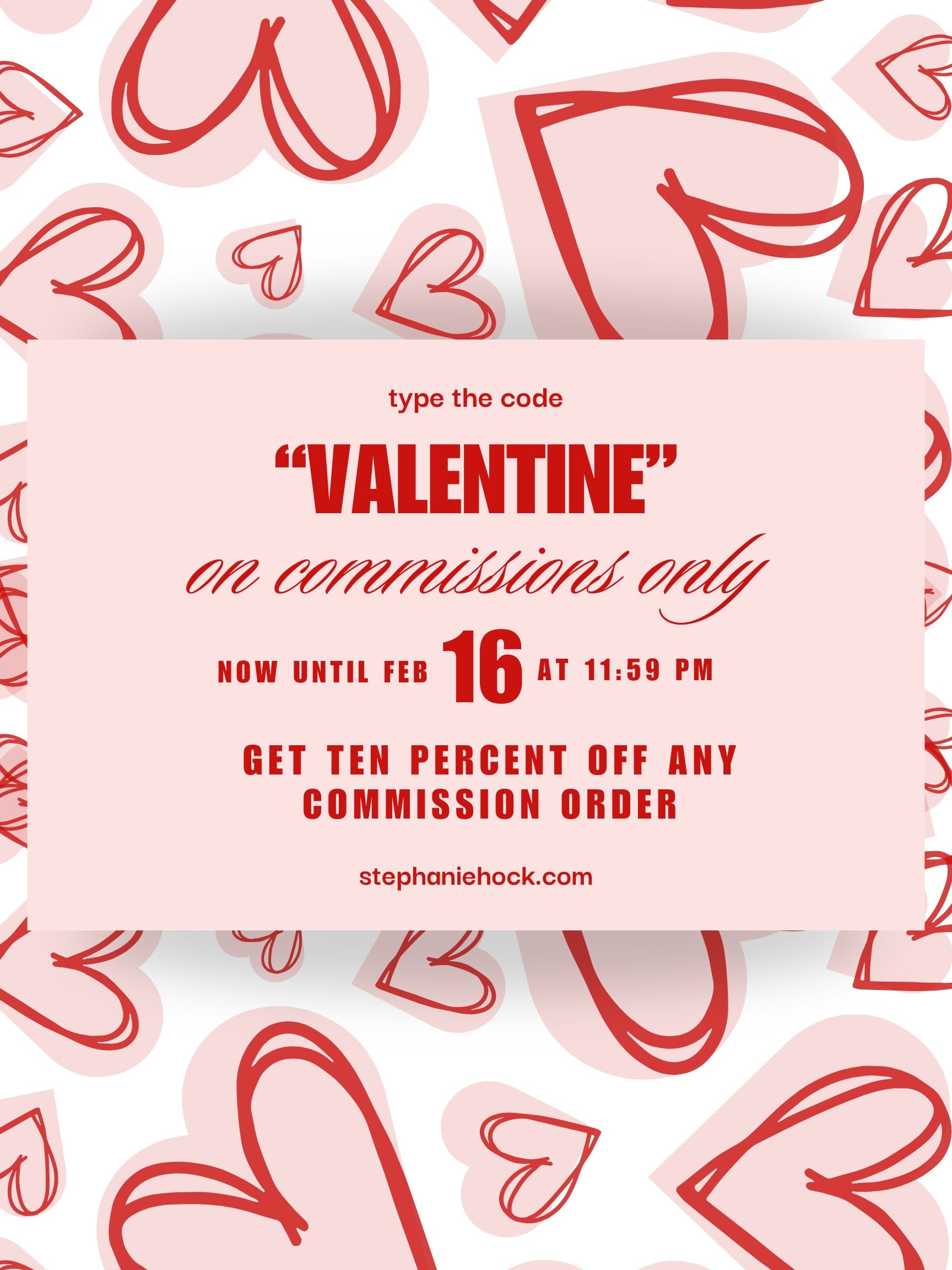 Start your commission here: https://www.stephaniehock.com/ and be sure to type “VALENTINE” in at checkout to get your discount!
