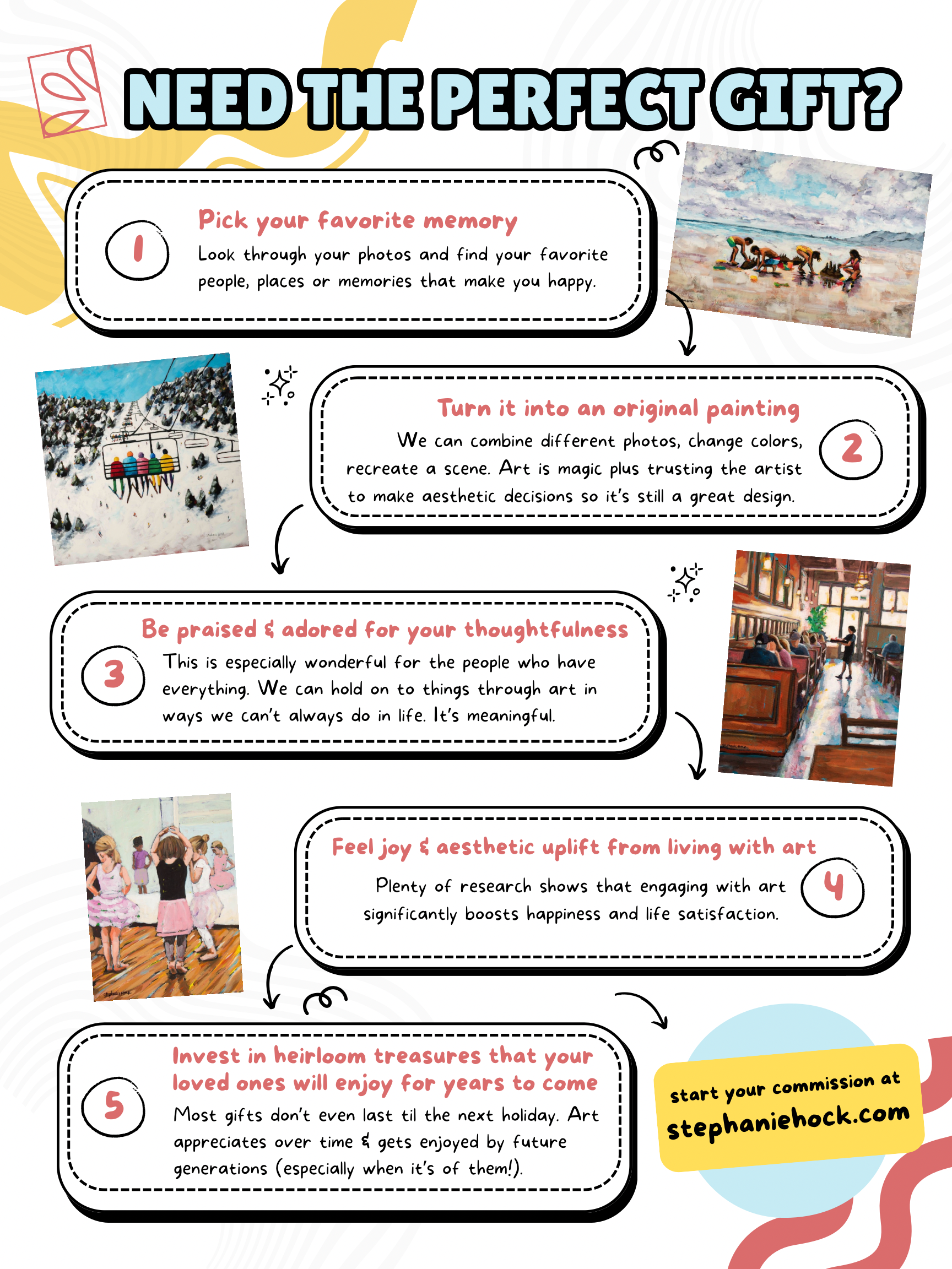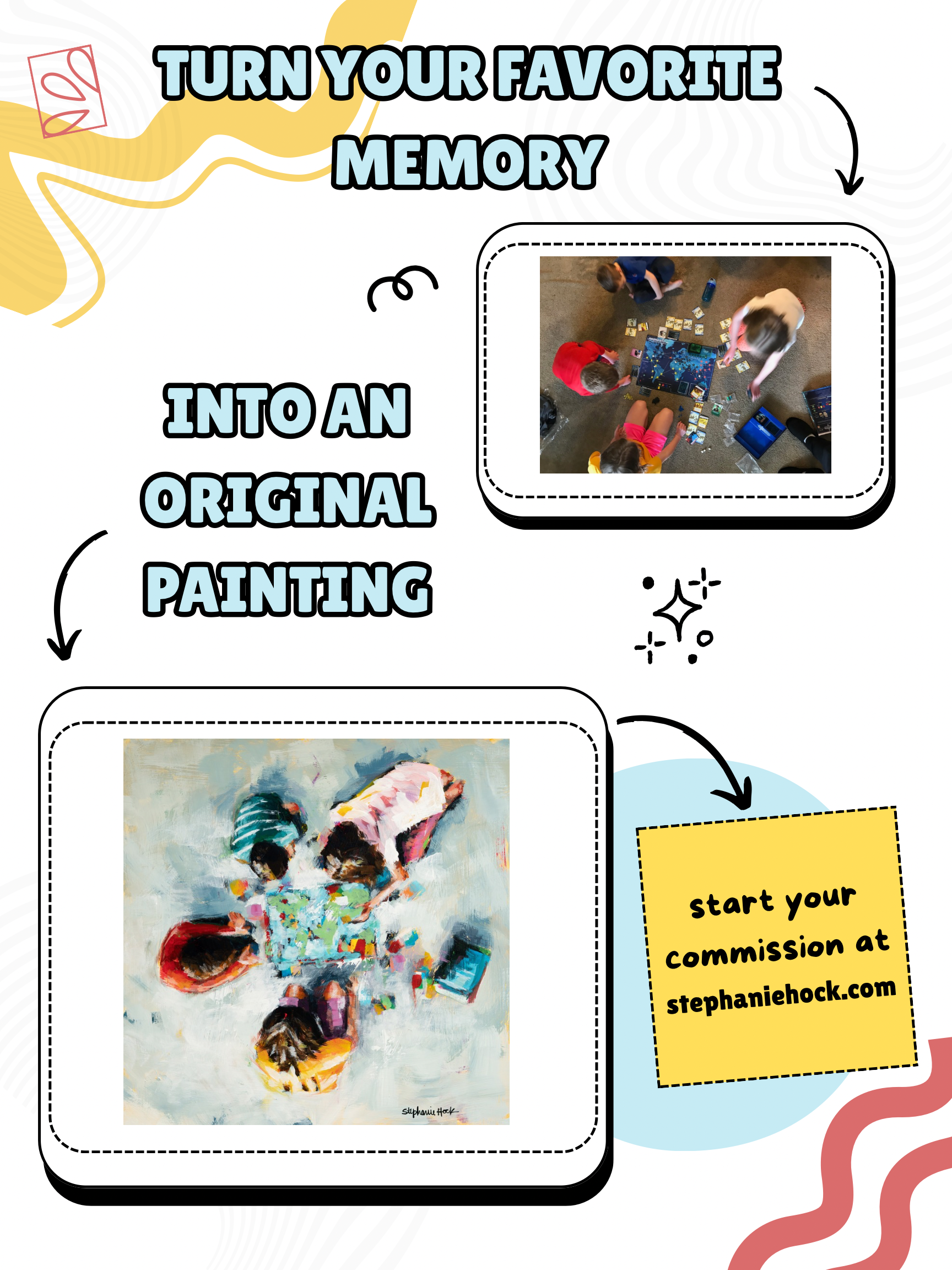 A: Yes! You can either add different sizes to the cart and checkout all at once or add multiple quantities of the same size (like if you were buying paintings for/of each grandchild). We’ll work on them as we’re ready and it’s okay if it’s not all at once. I have one collector who took advantage of a commission sale I had in 2018 and bought 10 and we’re still working through her list. She loves to reach out when she needs one as a gift or thinks of something else she wants. Prices have gone up quite a bit since then, so it was such a smart investment and fun to connect with her every time we do another one!