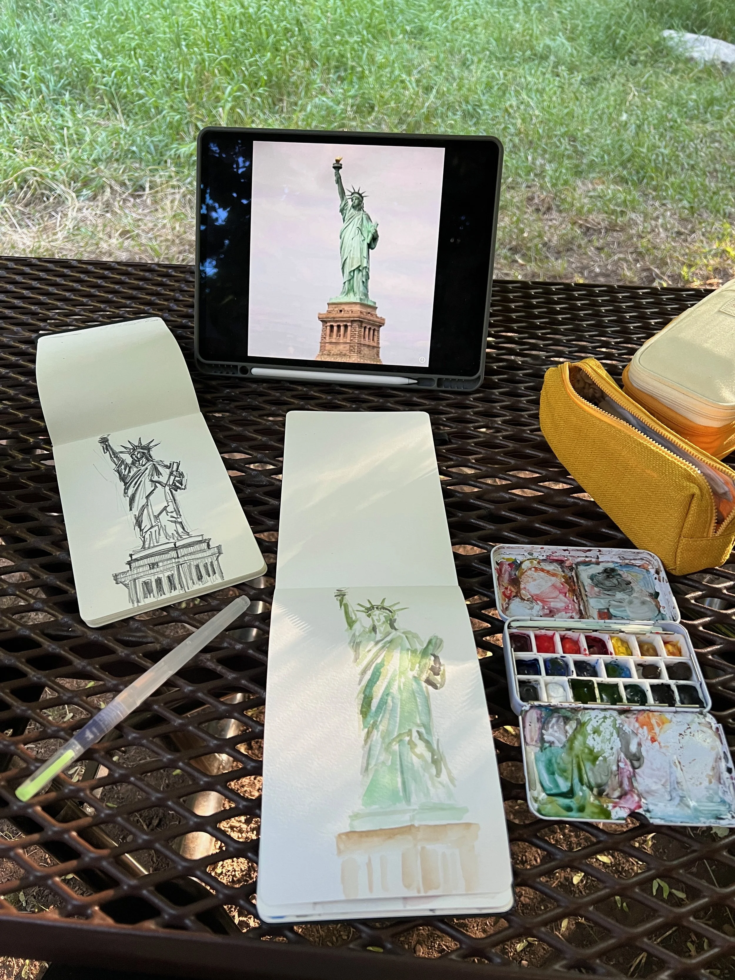 “In 2023, I crossed a lifelong dream off my bucket list and finally got to go to Europe for the first time. I fell in love with London and Paris, just as I imagined I would, and came home with thousands of photos and a head full of inspiration. Thanks to my brother’s wedding, I also went to New York City that same year and again came home full of photos and inspiration. I loved comparing three of the biggest cities in the world and pulling out details I loved about each of them. I wanted to paint paintings the way they feel in my sketchbooks when I’m on a trip—full of lines and quick marks. I wanted them to feel the way a trip feels in your memory, where some things stand out really clearly, full of color, and other things fade away, just rough background lines.