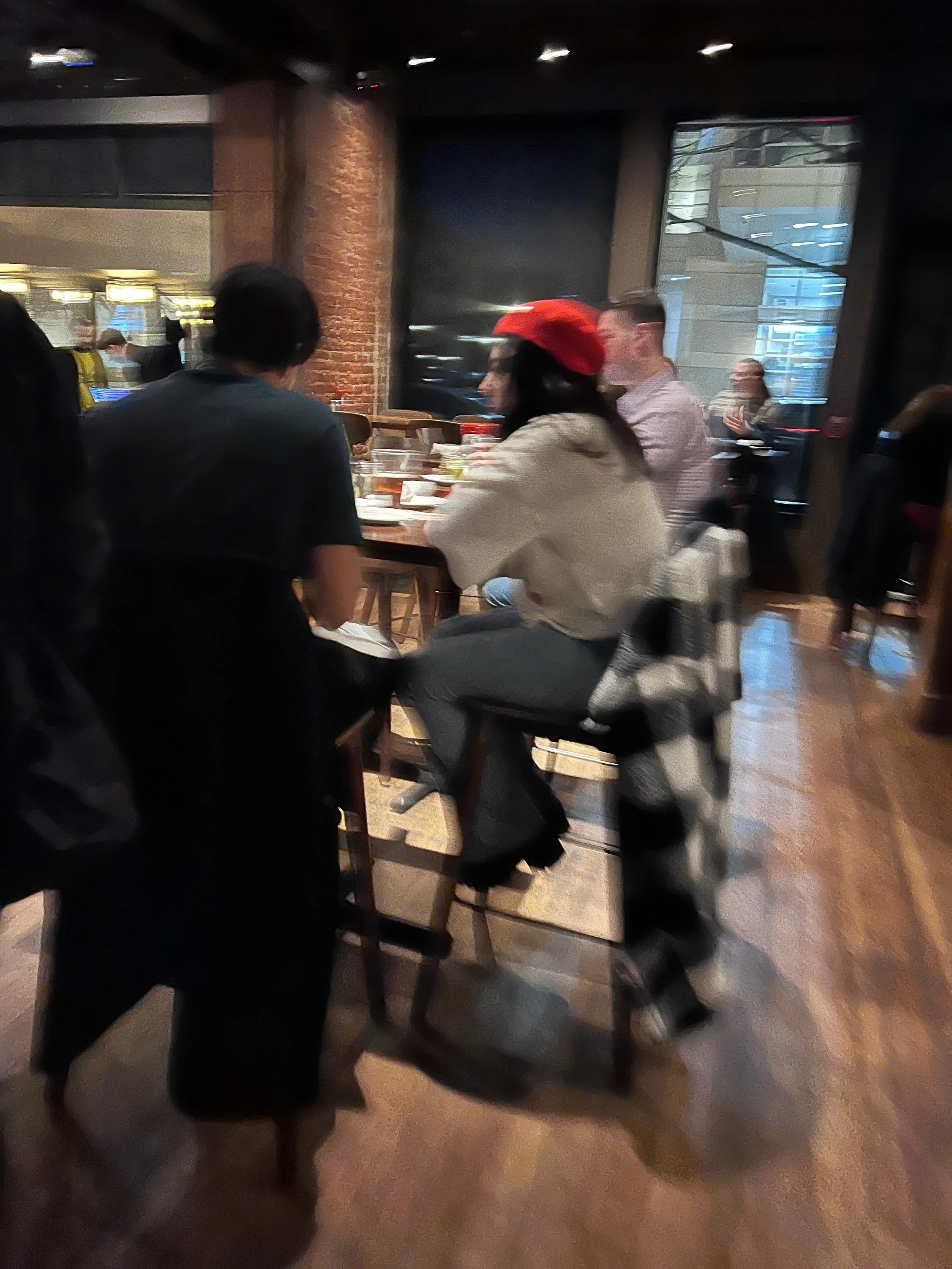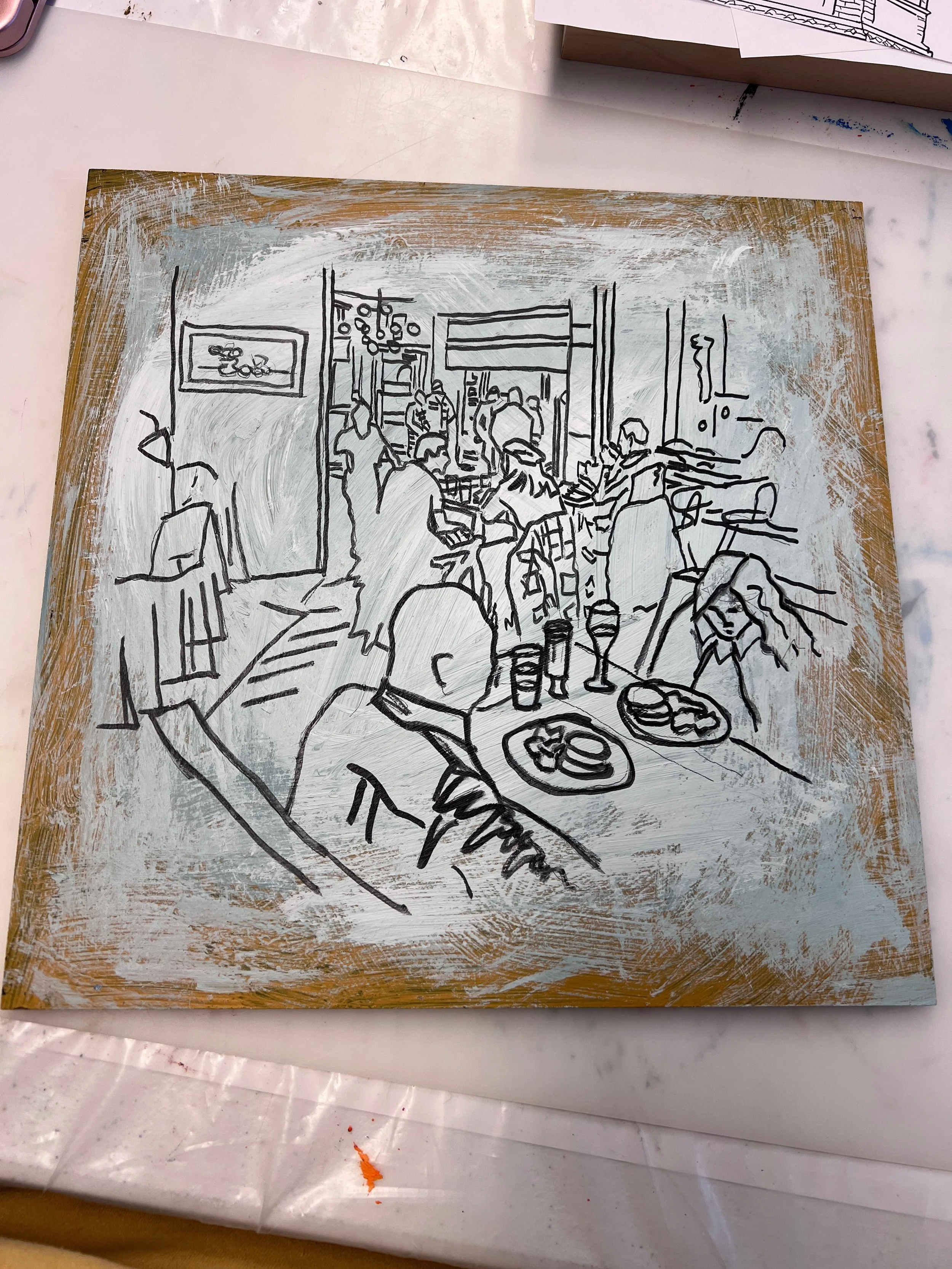 We were leaving dinner, walking through a crowded restaurant, and I caught a glimpse of a woman in a red beret. I grabbed my phone and snapped a quick, blurry photo, not even slowing my stride as we walked past their table and out of the restaurant. But in that moment, this whole show was born. What if I could paint a story that was just about her— just that one woman in full color and the rest of the busy crowded room faded away into just lines and less details? Because sometimes it feels like that, doesn’t it? Maybe there’s a whole world happening around you, but all you care about is the world happening WITHIN you, right in proximity to you— that’s where all the magic is. Does it even matter that other people were there except to be the background actors to your great story? To fill in and color the world that exists to support you and the people you love? It’s magic and they’re just lines, while you are full colors. Welcome to snapshots.