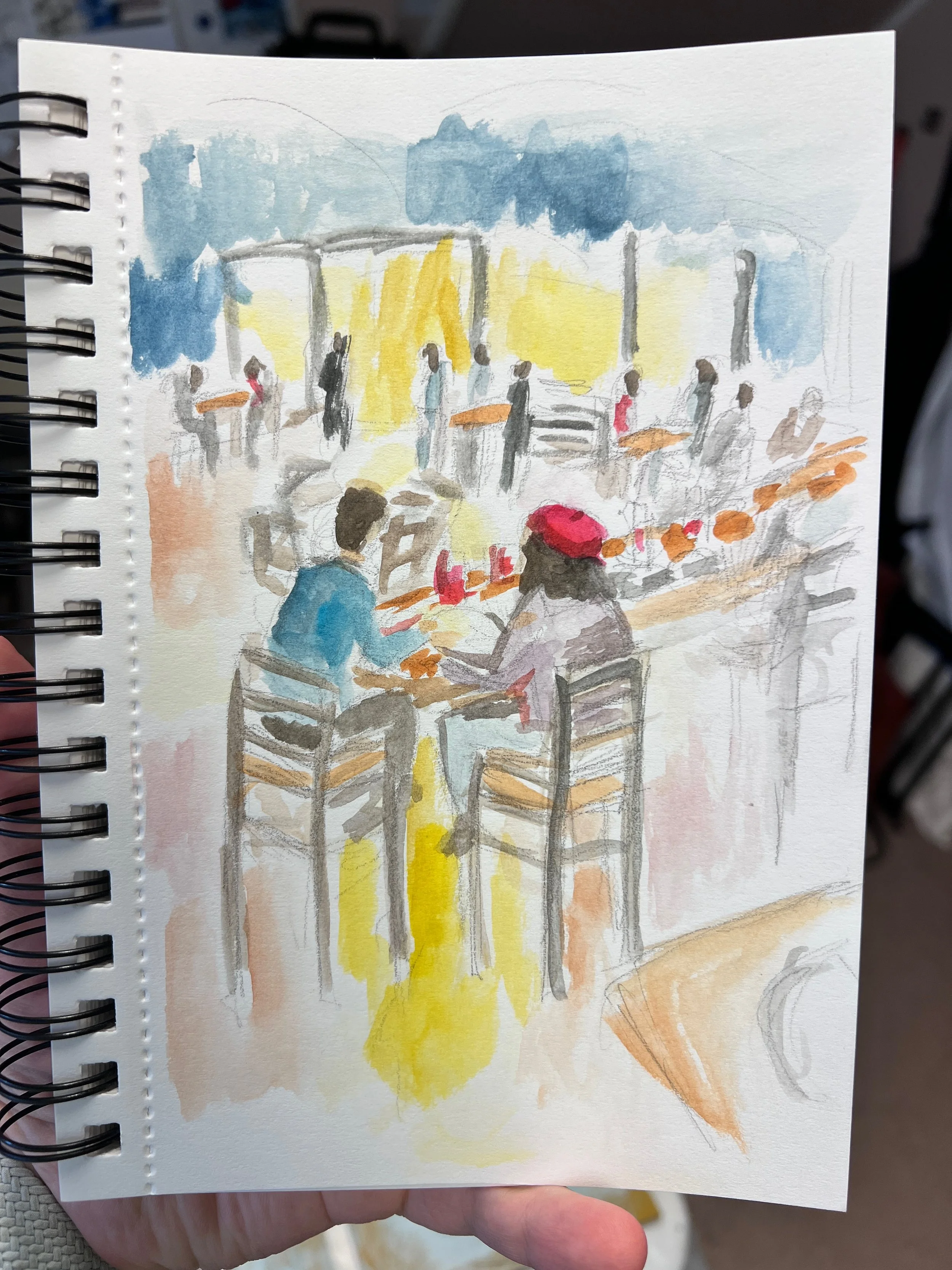 I stepped into the train station in Paris and gasped. It looked just like a Monet painting! Those windows and roof were exactly the same! As an art major in college, I spent years in dark lecture halls studying images of old paintings of things I didn’t care about—wars and historical stories painted in old styles with so much detail. I’d memorize dates and details for tests and then promptly forget them all. And then suddenly we got to the impressionist chapter and WOW! I was blown away by things like how Monet wanted to study the way light interacted with steam in the “modern” train station even though he was made fun of for painting something so rudimentary and commonplace. I loved the artists who laid their paint down so thickly to show off texture and let the world know they were a PAINTER. I got lost in the linework that showed through in the final painting— the simple gestures and unfinished look of so many masterpieces, letting your brain fill in the rest. I was so moved. THIS was what kind of artist I wanted to be. I don’t care about painting kings or conquerers, I want the stories of ordinary people, the beautiful life happening all around us. And here I was, all these years later, finally standing in a busy, ordinary Paris train station getting my own turn to be so moved by the light and the regular people hurrying through their day. I couldn’t help the tears that rolled down my cheeks as I took it all in. My own modern day Monet moment, my chance to make my own mark.